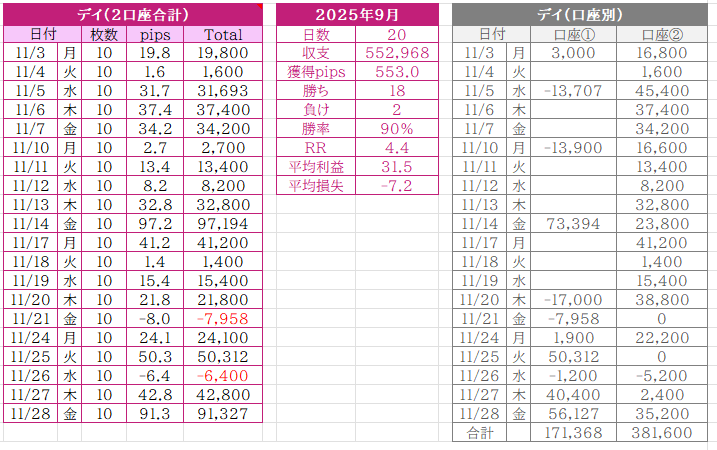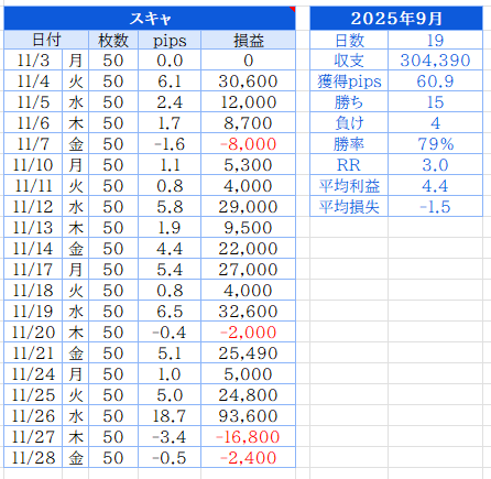 11月のスキャルピングはボラも程よくあり利益を積み上げることができました。ただ躊躇して入らずにとり逃した利益もかなり多くあったので、入るべきところをしっかり入れるように成功体験を積み上げて自信をつけていきたいです。