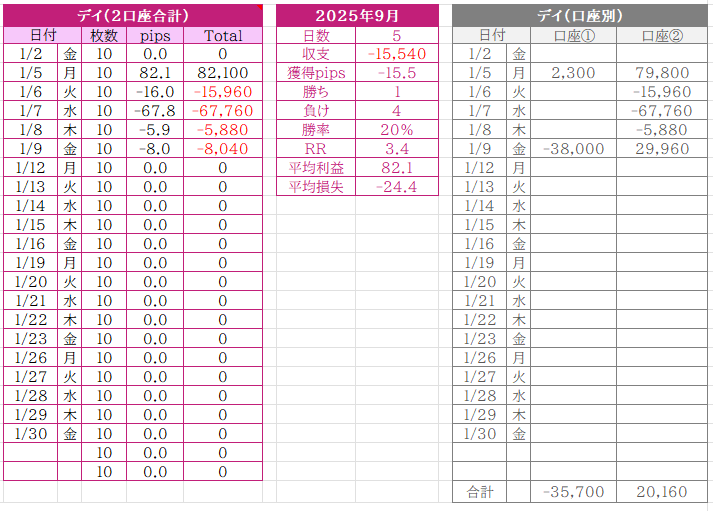 1月収支 日単位で1勝4敗
