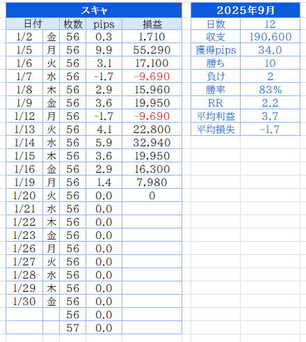 でした。1月初旬はマイナスでしたが、中旬の成績は良い結果でした。相場が荒れた日があって、そこでロスカットを喰らいましたが、それ以外はストレスなく利益を積み上げることができたと思います。