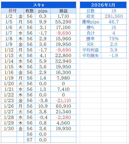 でした。26日以降は怒涛の5連敗で1月の利益が全て吹き飛びました。日米のレートチェックなどですごく荒れた値動きだったので、ノイズでストップにかかる展開が何度もあり辛い展開でした。