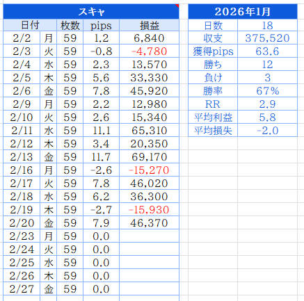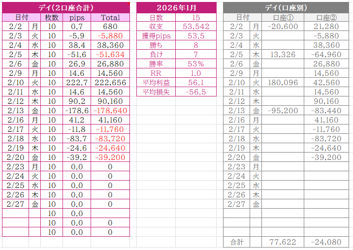 区間別収支2026年2月23日区間別収支(2月11日~2月20日) ポスト シェア はてブ 送る 区間別収支(2月11日~2月20日) デイトレ 区間収支 日単位で3勝5敗 -192,080円2月収支 日単位で8勝7敗+53,542円でした。13日が2口座とも大きく負けてしまい2月の利益を大きく減らしました。まさに13日の金曜日(笑)先週についても口座②のほうで4連敗があり、メンタル的に難しい周でしたがしっかりルール通りトレードすることが出来たことは良かったです(昔ならたぶん暴走してた・・) デイトレは2つの口座で運用してますが、そのうちの一つがMT4口座なのでゴゴジャンのRealTradeに参加中(口座①のほう)→RealTrade スキャルピング 区間収支 日単位で6勝2敗 +252,320円2月収支 日単位で12勝3敗+375,520円でした。ボラティリティがありスキャはやりやすい環境でした。ただ、やるべきでないところで手を出して無駄な損切りを繰り返した日もあり、そこが反省点です。日々上達している実感はあるので、この調子で続けていきたいです。 スキャ口座はトレアイに参加中→トレードアイランド