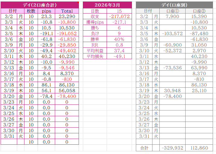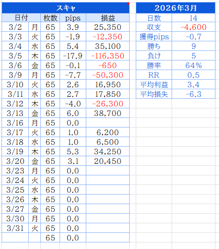 でした。戦争ネタで相場参加者が様子見をする中、なんとかプラスを積み重ねてトントンくらいまで持っていけました。ボラも低下していてスキャはやりづらく、しばらくは我慢の日々が続きそうです。